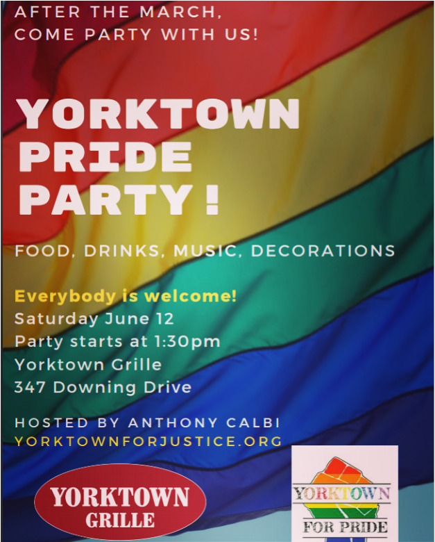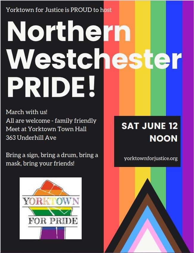 Join us for this historic event – Yorktown’s first ever Pride March! We march to celebrate and to call attention to the ways that the LGBTQ+ community is still not done fighting for equality and liberation. Join us Saturday June 12 beginning at noon sharp so come early! Park in the old K-Mart lot and walk over to Yorktown Town Hall at 363 Underhill Ave.