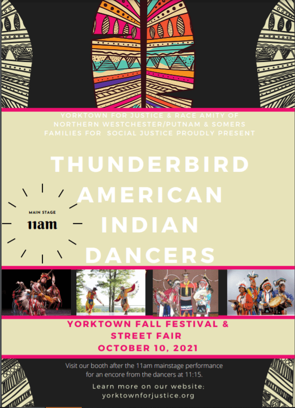 Our GoFundMe was fully funded for the Thunderbird American Indian Dancers! Thank you so much to everyone who contributed. We are honored to bring the oldest indigenous dance troupe in NY to Yorktown. They will be kicking off the day with a 15 minute main stage performance beginning at 11am. So come out early! They will also be joining us at our booth directly following the main stage performance. We’ll be there all day. If you would like to get involved in helping at our booth or planning an activity, email us at yorktownforjustice@gmail.com.