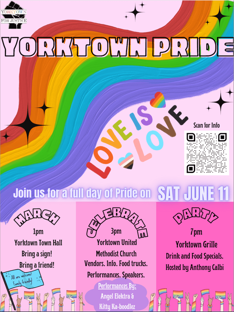 After the march, head over to the Yorktown United Methodist Church at 2300 Crompond Rd Yorktown Heights, NY on 202, across from the police station, for our festival! If you need a ride from the march, let an organizer know (you’ll be able to spot us!) and we’ll get you there. Join us from 3-6pm to enjoy performances, speakers, vendors, small businesses, information, food trucks, activities for the kids, and more! MCed by local sensations Angel Elektra and Shay D’Pines, who will also be performing! If you would like to perform or table at the event, please fill out this brief google form: https://forms.gle/PTka49ymBbL9Q9zk8
